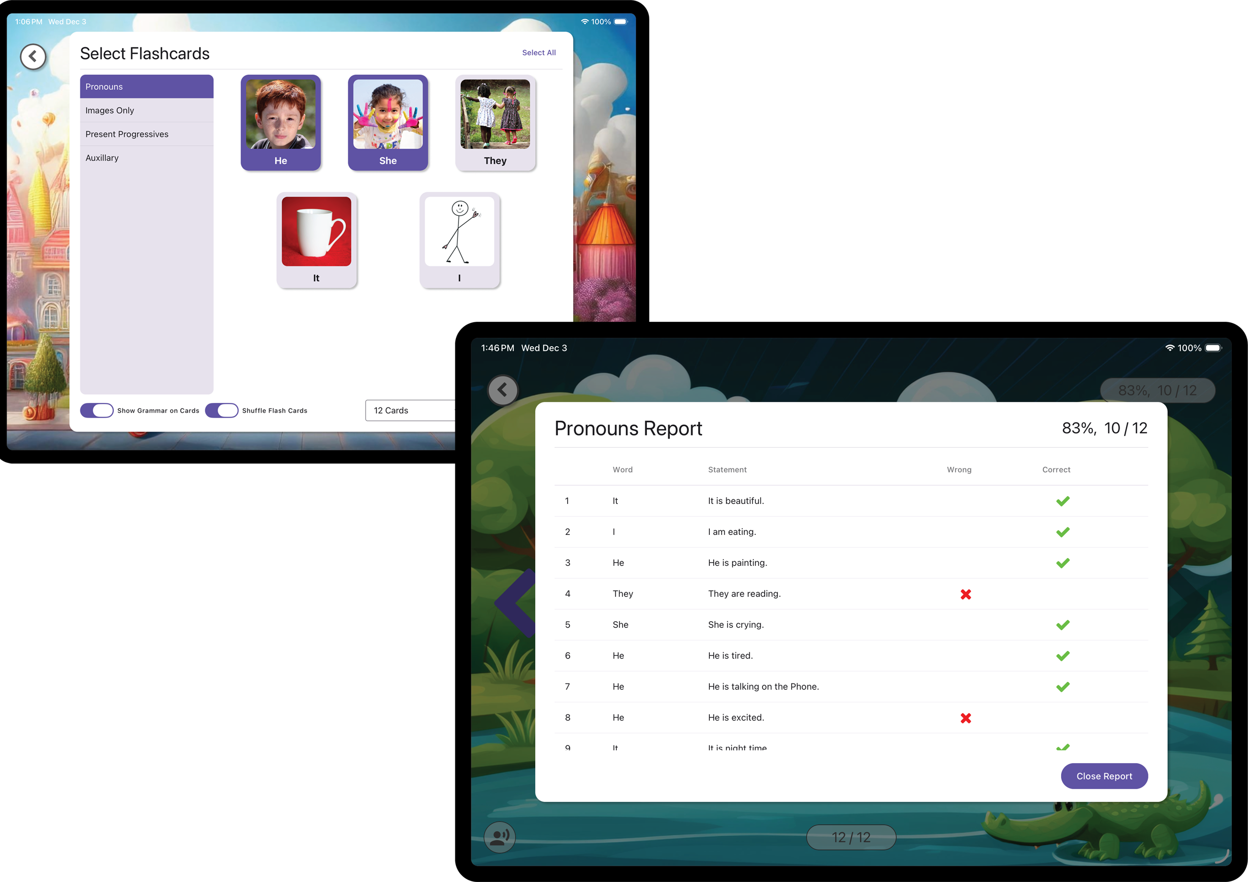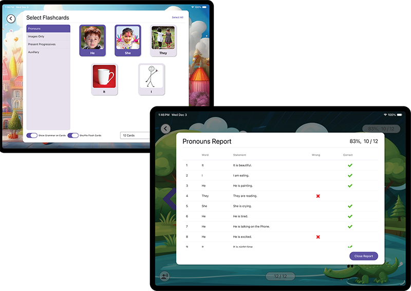 The app offers some options to change how the flashcards appear to the child. There currently is no ability to add custom set of flashcards to Grammar with Ease. However we are always improving the app, and would welcome an email with suggestions.